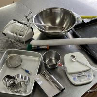 さあ、料理室へ入ってみましょう テーブルが6台と先生用が正面に1台 鍋やらやかん、食器に細かい調理道具がいっぱい。 冷蔵庫や電子レンジ、ガスオーブンもあるよ。 道具の準備はOK! パン生地をこねて、焼いてみよう‼ お菓子 …