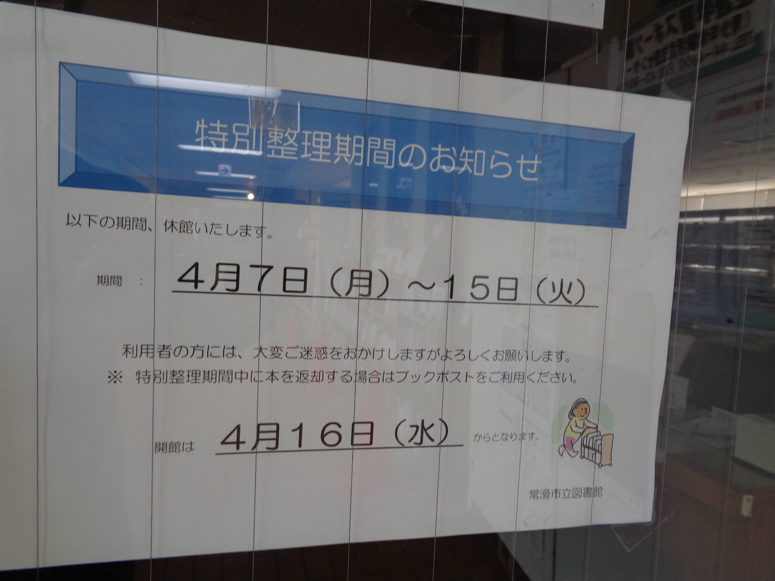 さて図書館よりお知らせですが、本日4月8日(火)から15日(火)まで常滑市立図書館全館とともに南陵分館も特別整理期間のため休館となります。(こども図書館は4/7より)