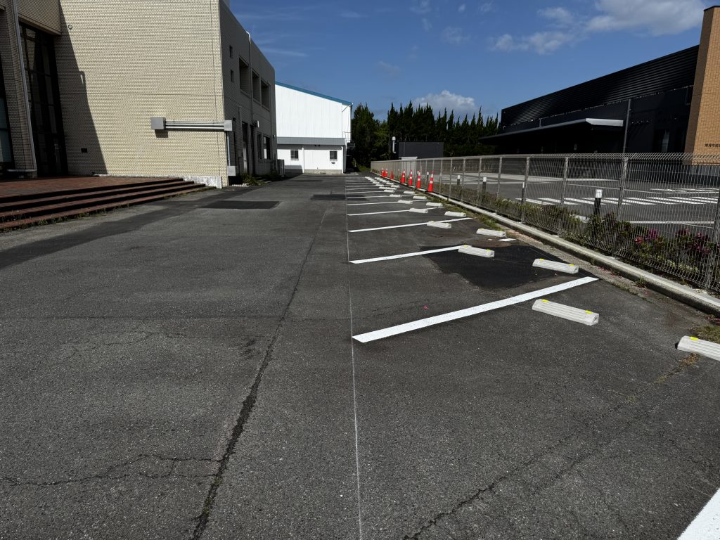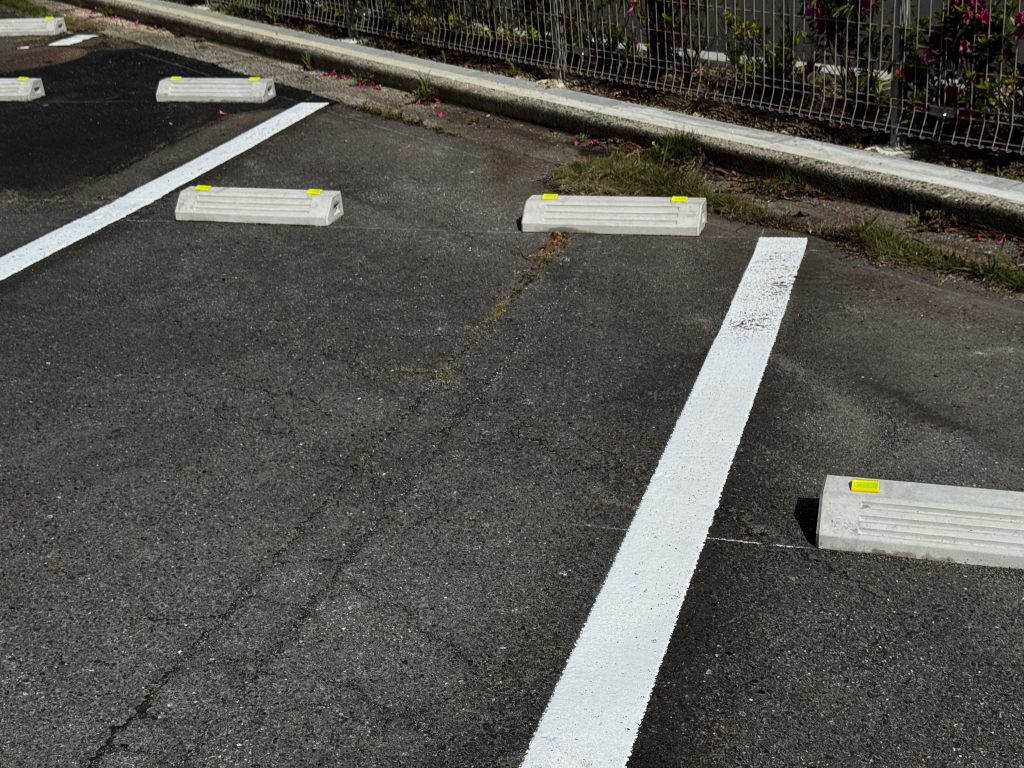 長らく気になっていたアスファルトの穴をきちんと補修し、さらに新たに白線を敷き直し、車止めも設置しました!