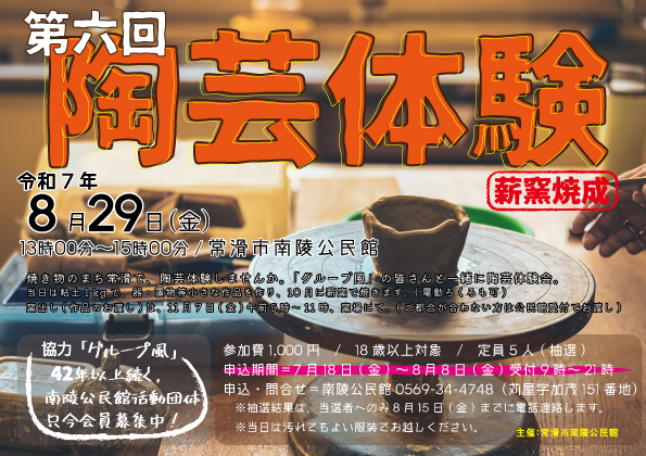 ■内容 「焼き物のまち常滑」で、陶芸体験をしませんか。当日は粘土1㎏で、器・置物等を作り(電動ろくろも可)10月に新窯で焼きます。