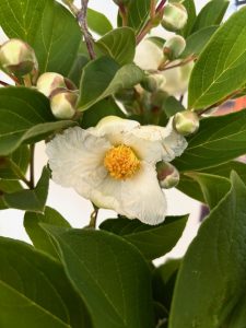 沙羅の花はナツツバキとも呼ばれ、初夏に咲く椿の仲間で透き通るような白い花びらと黄色のしべが特徴です。