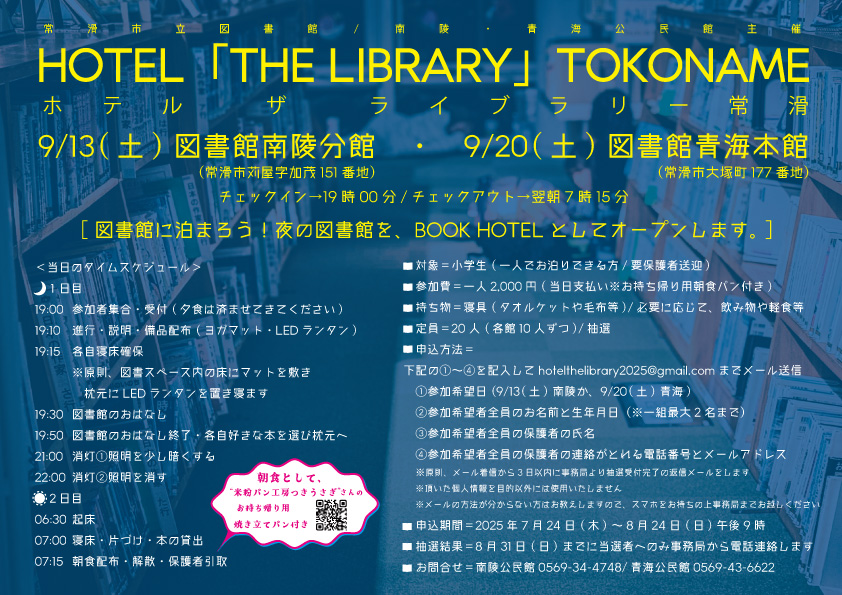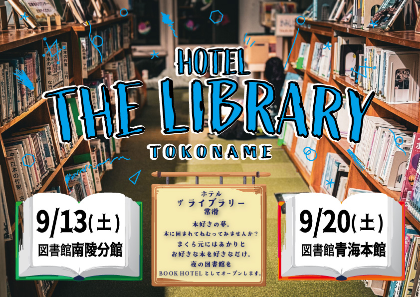 今年3回目の開催となる「ホテル ザ ライブラリー 常滑」ですが、明日から申し込みが始まります。小学生対象でいわゆるブックホテルをイメージして夜図書館に泊まれるという体験ができる事業です。南陵公民館は9月13日(土)夕方から14日(日)早朝にかけてのと、青海公民館は9月20日(土)夕方から21日(日)早朝にかけての2回の開催を予定しています。毎年人気のある事業であるため、参加者は抽選によって決まります。メールにてお申込みできますが、詳細は以下のチラシをご覧ください。たくさんのお申込みをお待ちしています。