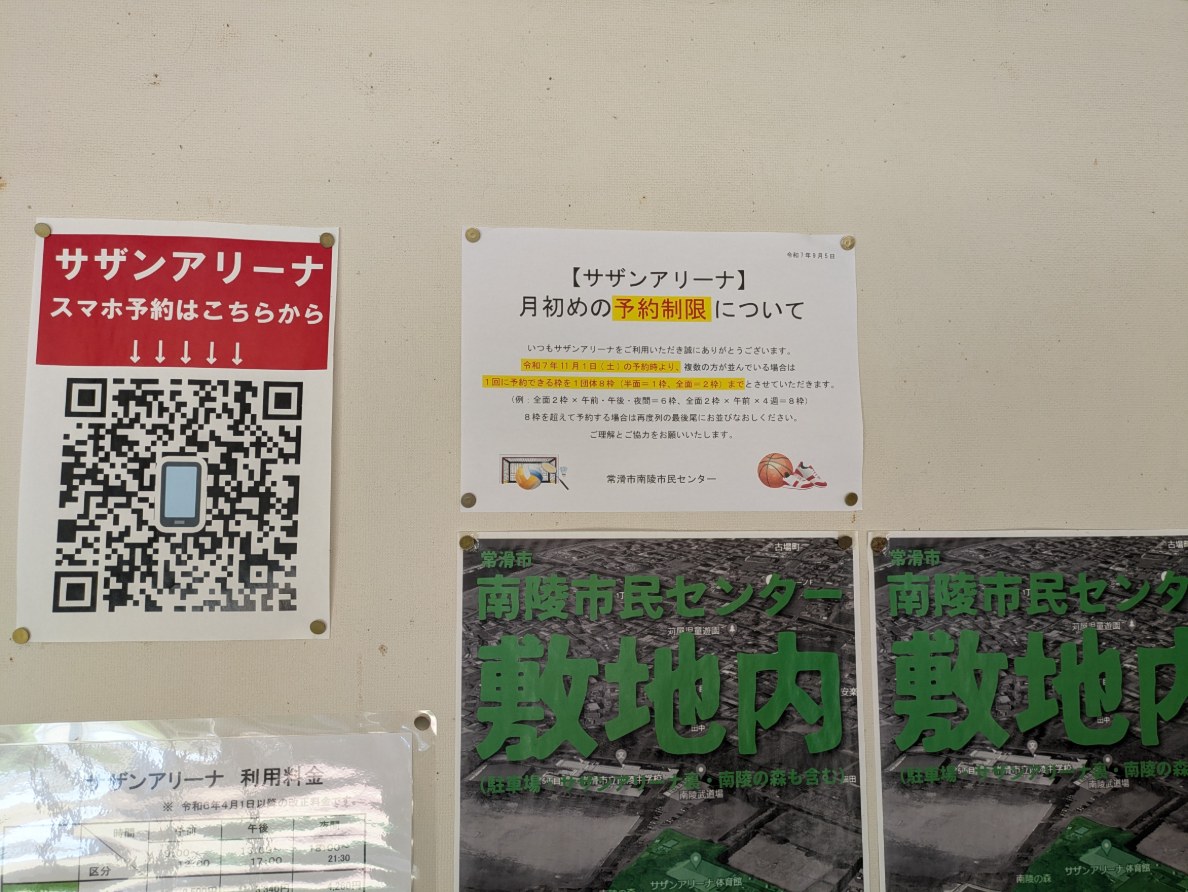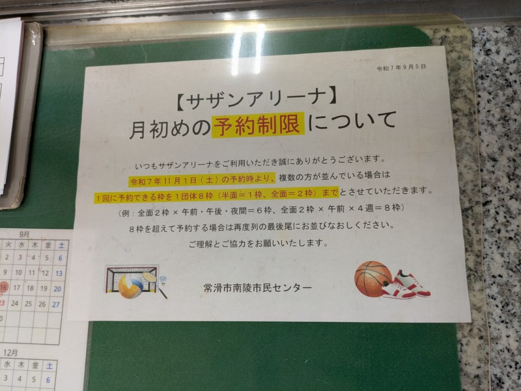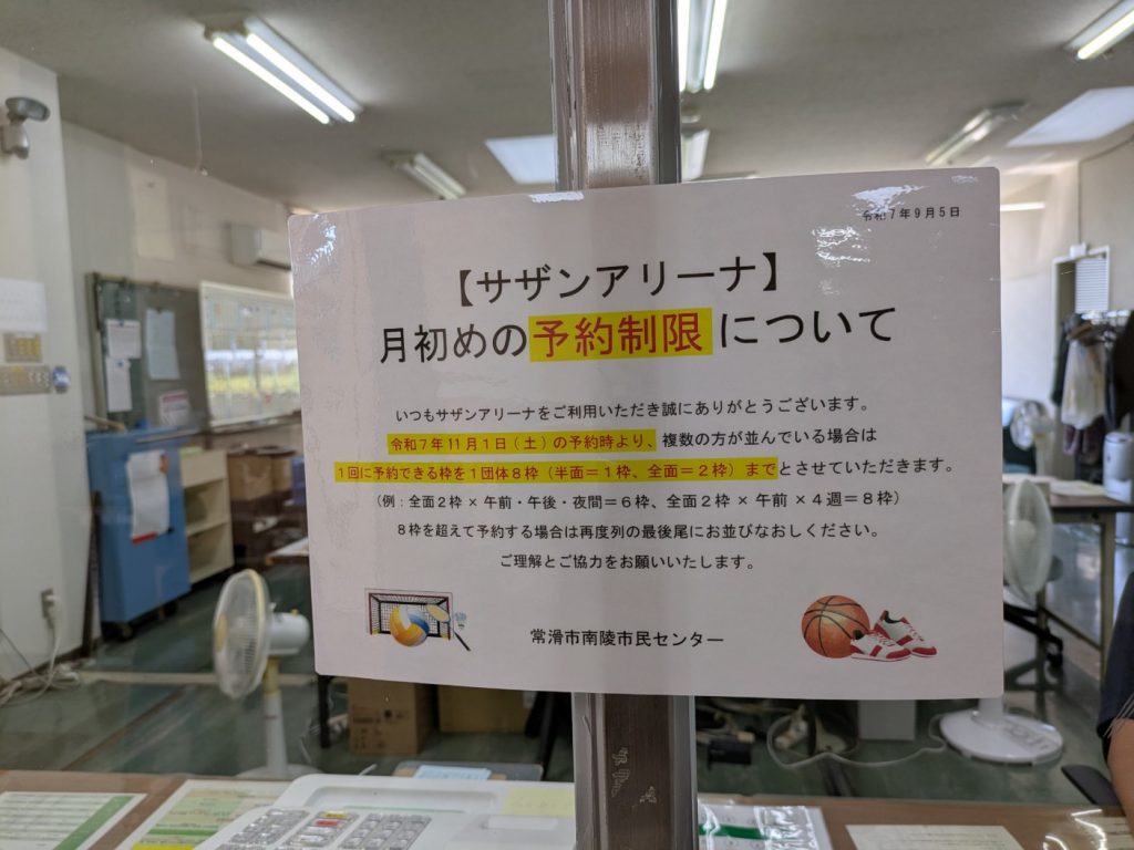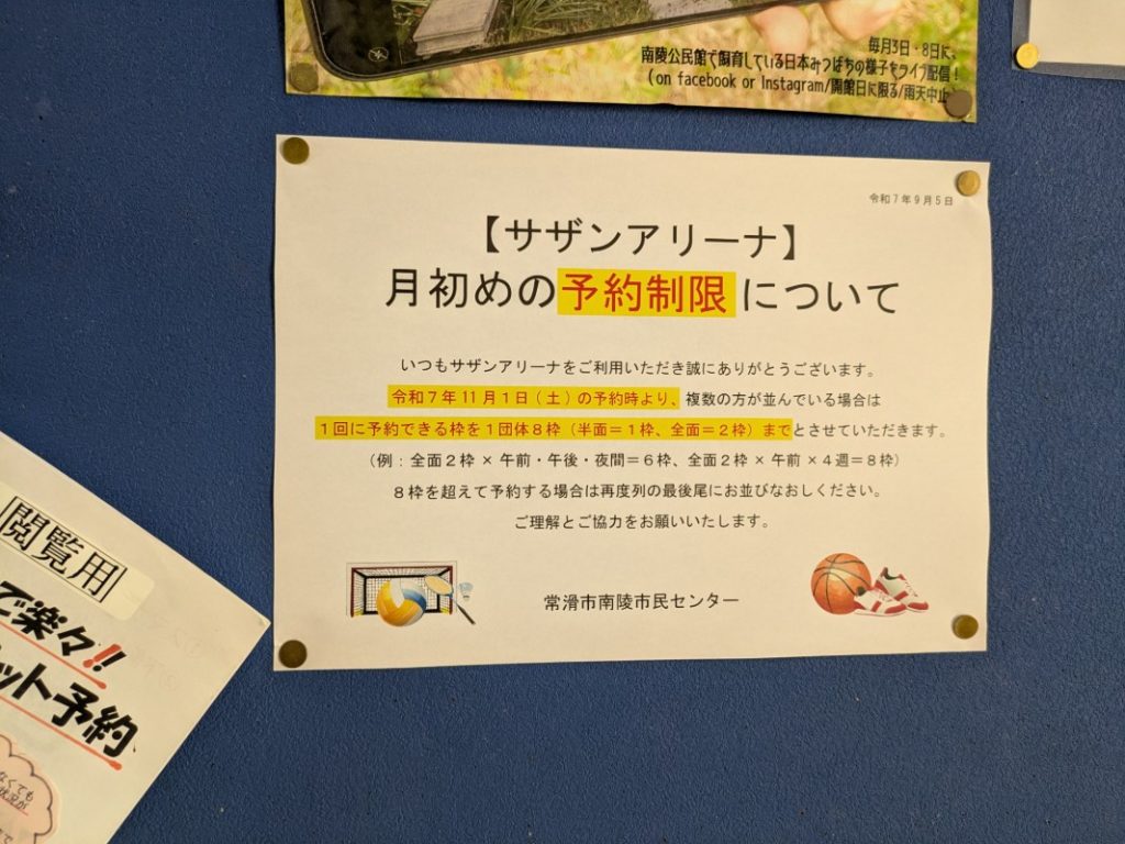 令和7年11月1日(土)の予約時より、複数の方が並んでいる場合は 1回に予約できる枠を1団体8枠(半面=1枠、全面=2枠)までとさせていただきます。 (例:全面2枠×午前・午後・夜間=6枠、全面2枠×午前×4週=8枠)