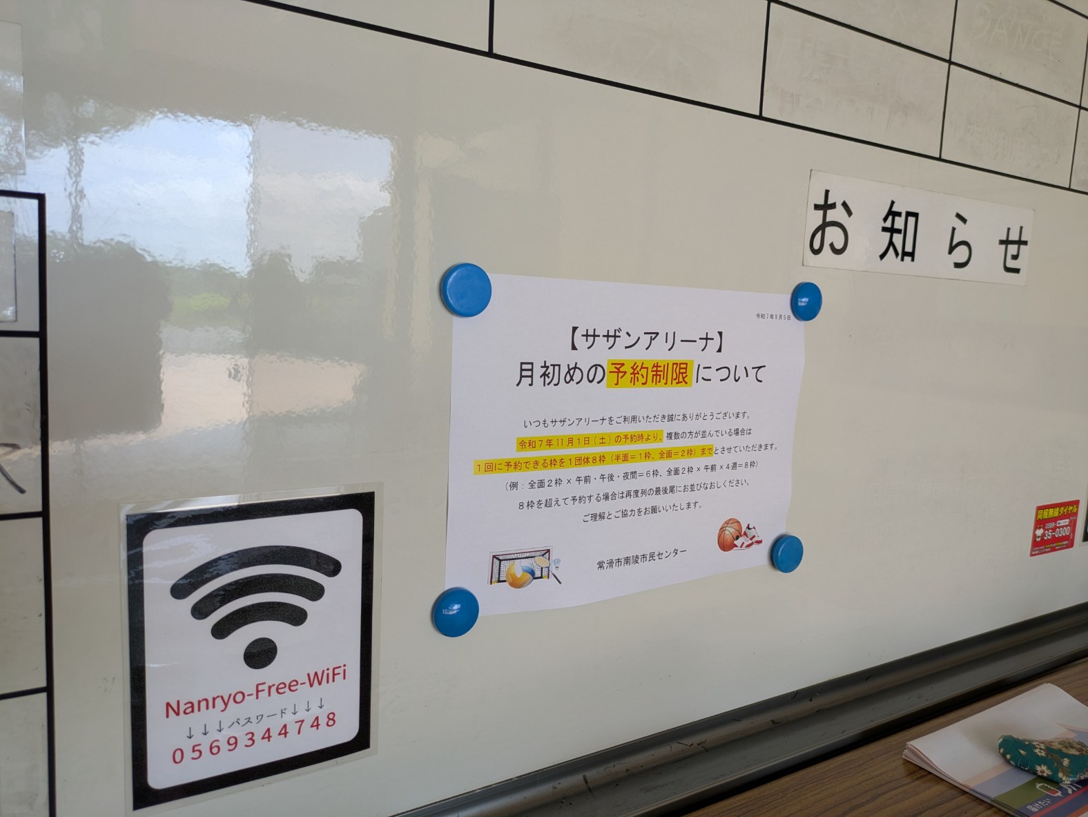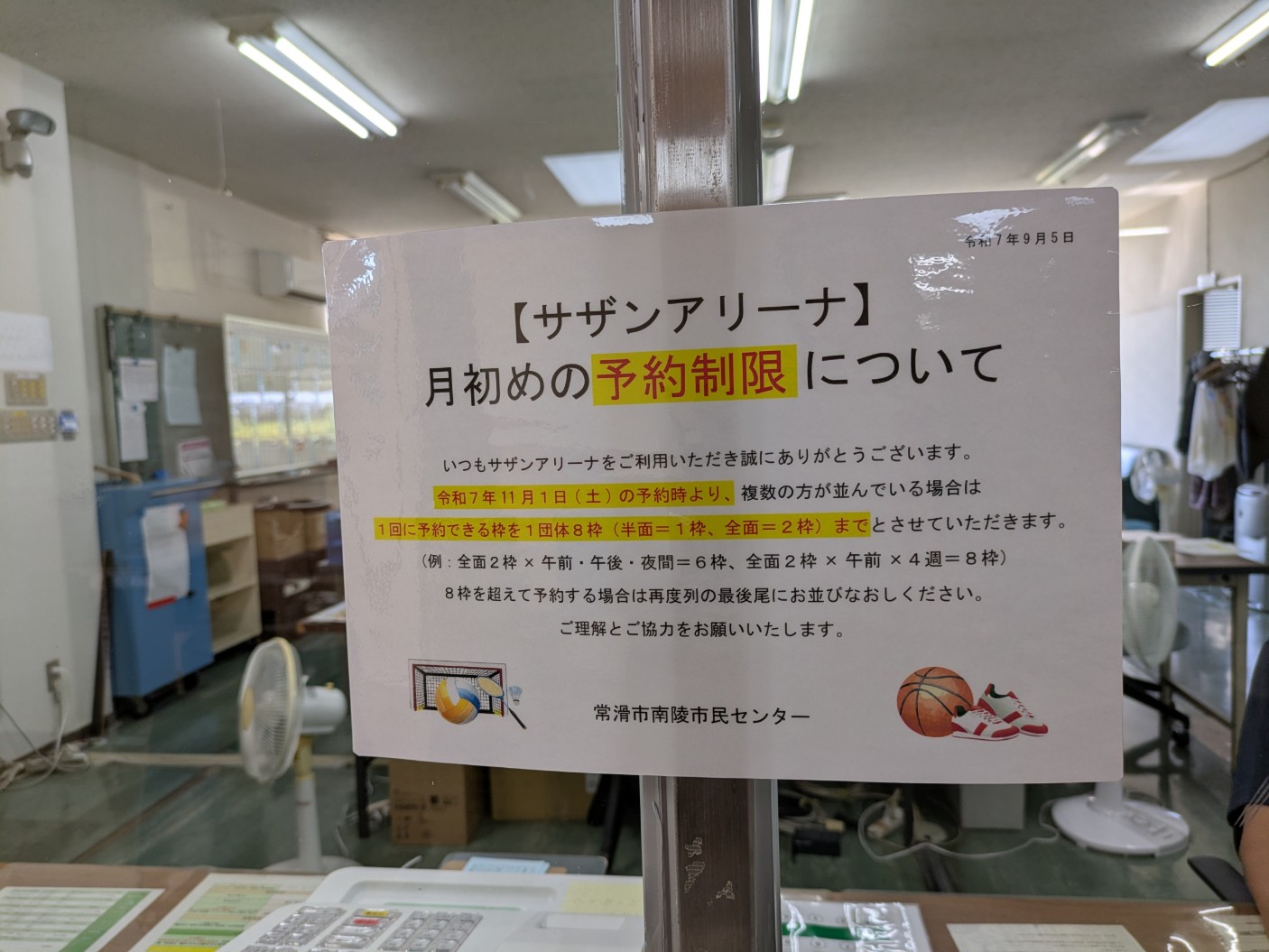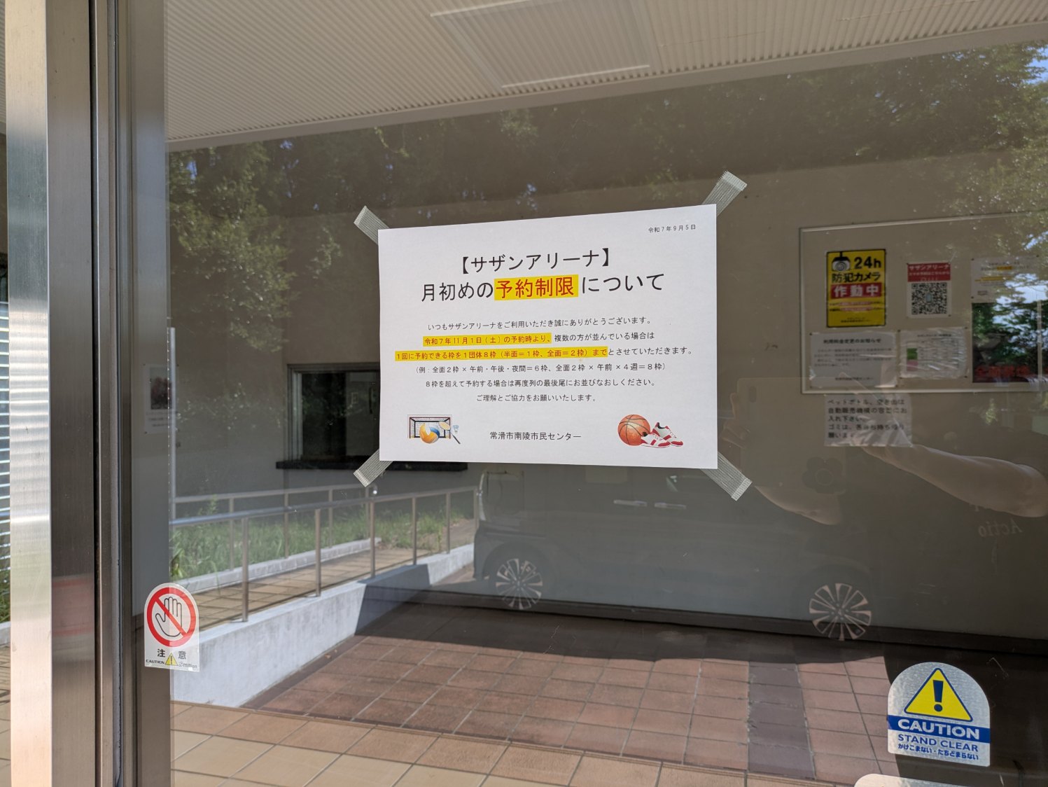 令和7年11月1日(土)の予約時より、複数の方が並んでいる場合は 1回に予約できる枠を1団体8枠(半面=1枠、全面=2枠)までとさせていただきます。 (例:全面2枠×午前・午後・夜間=6枠、全面2枠×午前×4週=8枠)