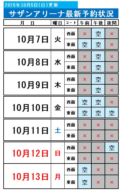 ◎本日より5日先まで、ネットでの空き状況はご確認いただけませんので下記の日程表をご覧ください。 尚、キャンセルまたは前日までのお支払い等で、変更になる場合がございます。 当日利用をご希望の方は、当日にお電話か窓口にてお問い合わせください。 占有はできませんので、皆さんでシェアをお願い致します。