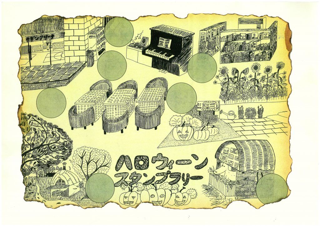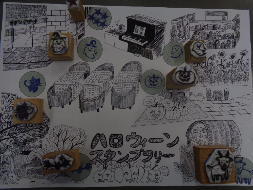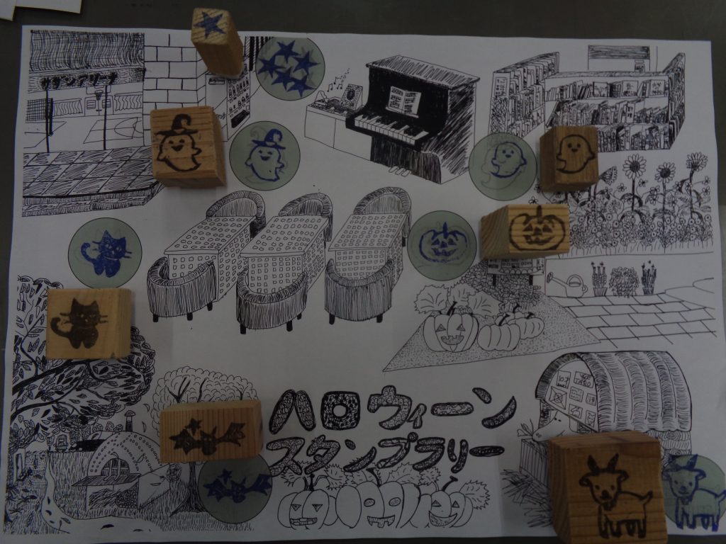 ハロウィンにあたって、ちょっとした遊びをスタッフのみなさんで作りました。ほんのり宝探し気分で館内を回って、オリジナル消しゴムスタンプを台紙に押すという内容です。初めての試みですが、やり方はあれこれ決まらないままですが、参加してくれる方がいればうれしいです。