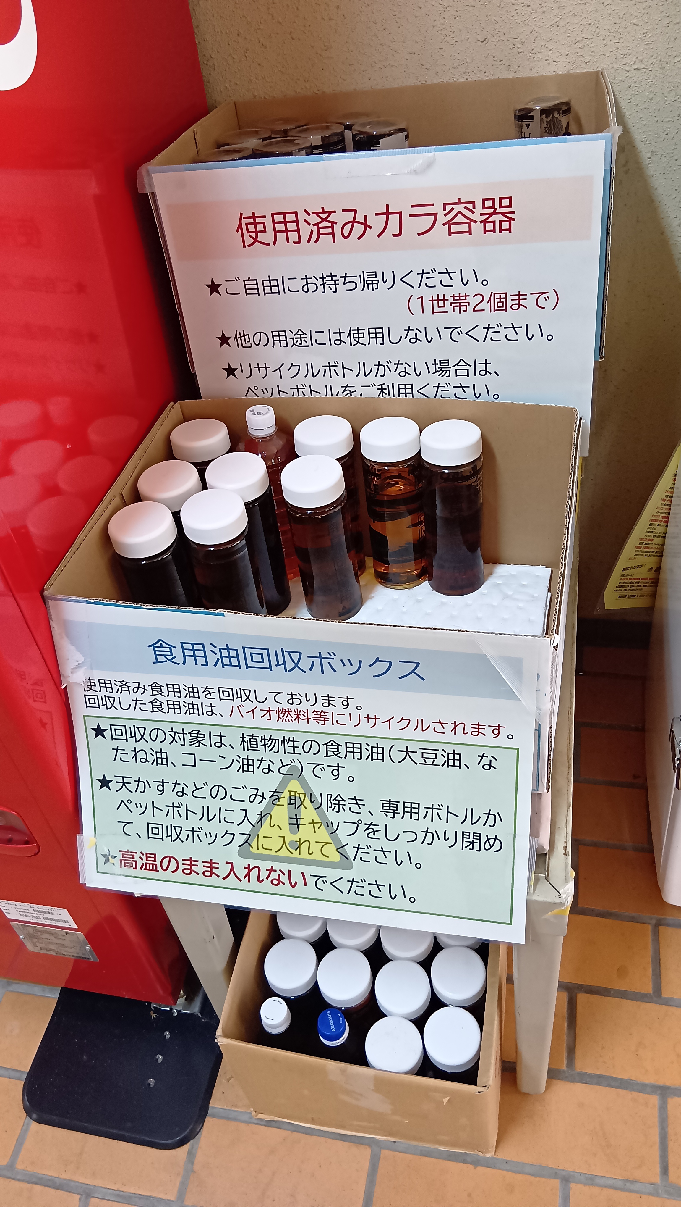 南陵公民館では廃油の回収を行っています。また、廃油用の専用ボトルも一緒にご用意してあります。不要になった廃油は、当館へお持ち込みください。もちろん、ご自宅にあるペットボトルに入れて持ち込んでいただいてもかまいません。気軽に南陵公民館へお持ち込みください。お持ち込みの際には、天かすなどの固形物を取り除いてください。回収BOXは、南陵公民館西側出入口(自動販売機左手)側に設置してあります。