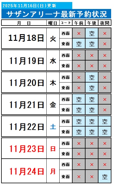 ◎本日より5日先まで、ネットでの空き状況はご確認いただけませんので下記の日程表をご覧ください。 尚、キャンセルまたは前日までのお支払い等で、変更になる場合がございます。 当日利用をご希望の方は、当日にお電話か窓口にてお問い合わせください。 占有はできませんので、皆さんでシェアをお願い致します。