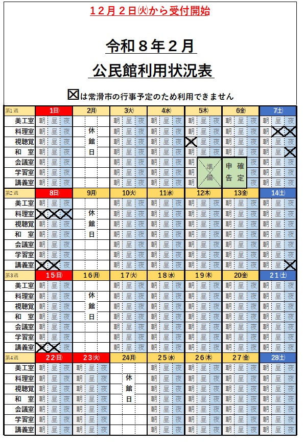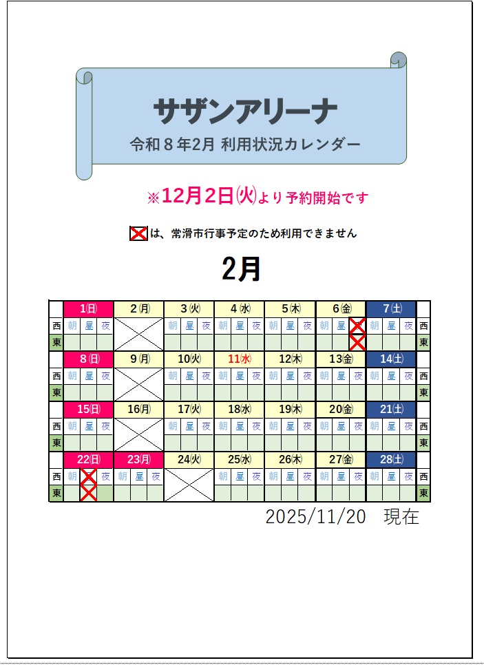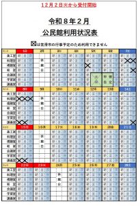 と、いうことで どうそ笑ってご覧くださいませね。 サザンアリーナと公民館の 来年2月の利用状況です。 開始日は 12月2日(火曜)午前9:00~ 窓口にて順に受付いたします。