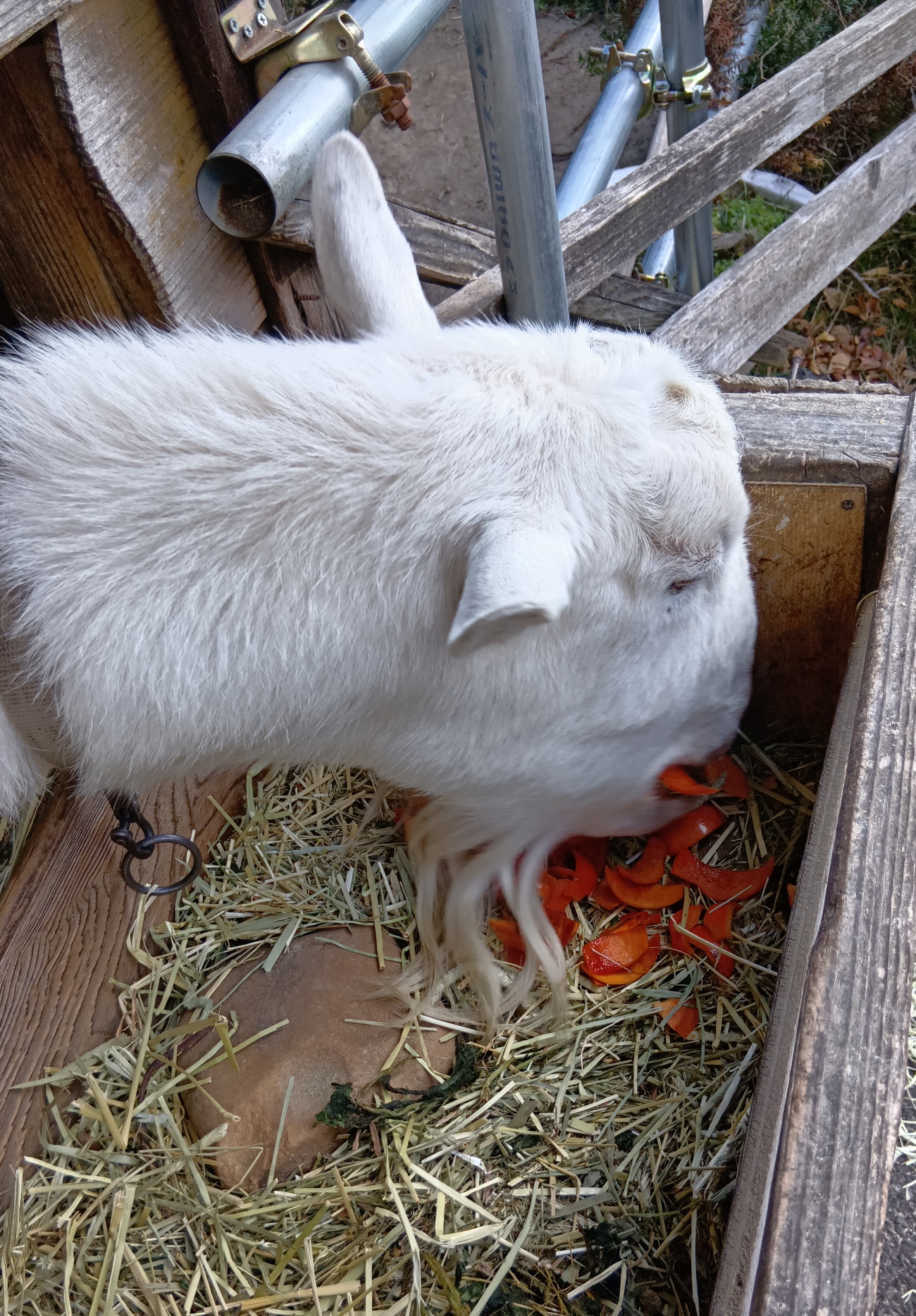 今日は、あたたかな日差しが差し込んで、気持ちのいい朝を迎えています。でも、ここ数日は寒い帆が続いていたので、しろたろうの様子をこまめに見ていました。昨日もお昼頃行くと、どなたからか柿をもらったようで、一心不乱にそれを食べていました。実は数日前にも、えさ箱に人参のヘタたがたくさん入っていて、それを美味しそうに食べていました。いつも地域の皆さまが、しろたろうのことを気にかけていただき本当にありがとうございます。多くの方々に愛されて、本当に幸せ者だと思います。
