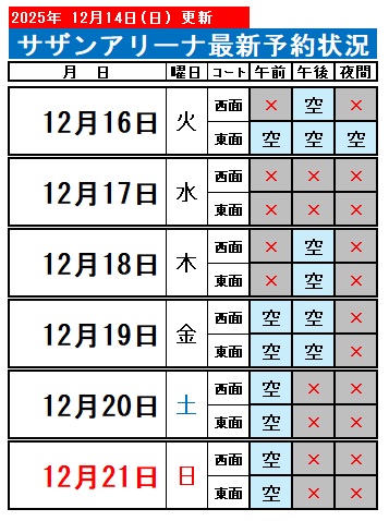 ◎本日より5日先まで、ネットでの空き状況はご確認いただけませんので下記の日程表をご覧ください。 尚、キャンセルまたは前日までのお支払い等で、変更になる場合がございます。 当日利用をご希望の方は、当日にお電話か窓口にてお問い合わせください。 占有はできませんので、皆さんでシェアをお願い致します。
