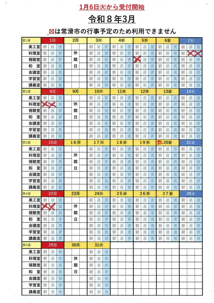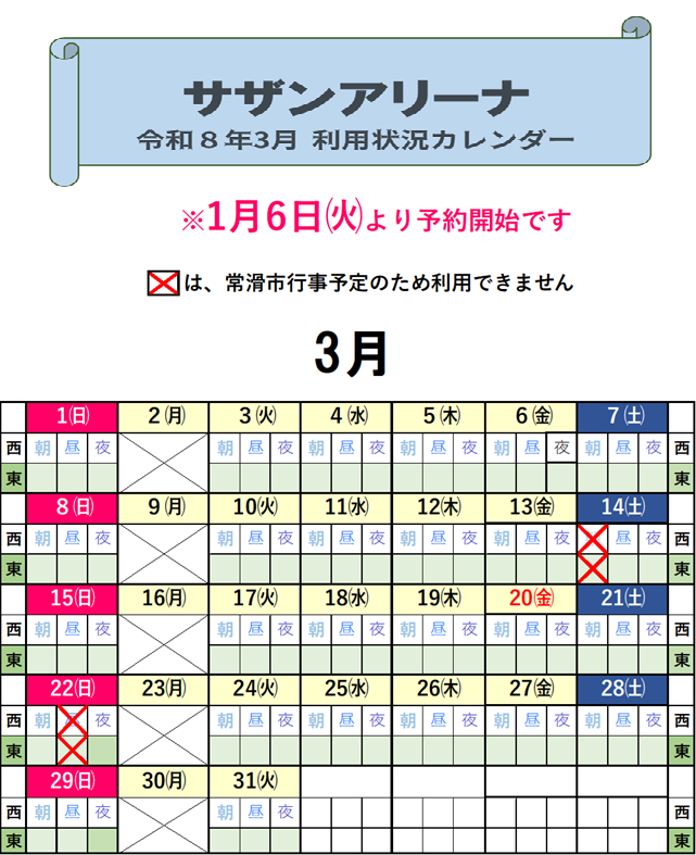 12月27日(10:30)現在、3月分の公民館の利用状況に変更はありませんが、サザンアイーナに関して若干の変更(12月21日の南陵日記以降)がありましたので、再度掲載させていただきました。ご確認をお願いいたします。