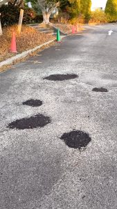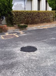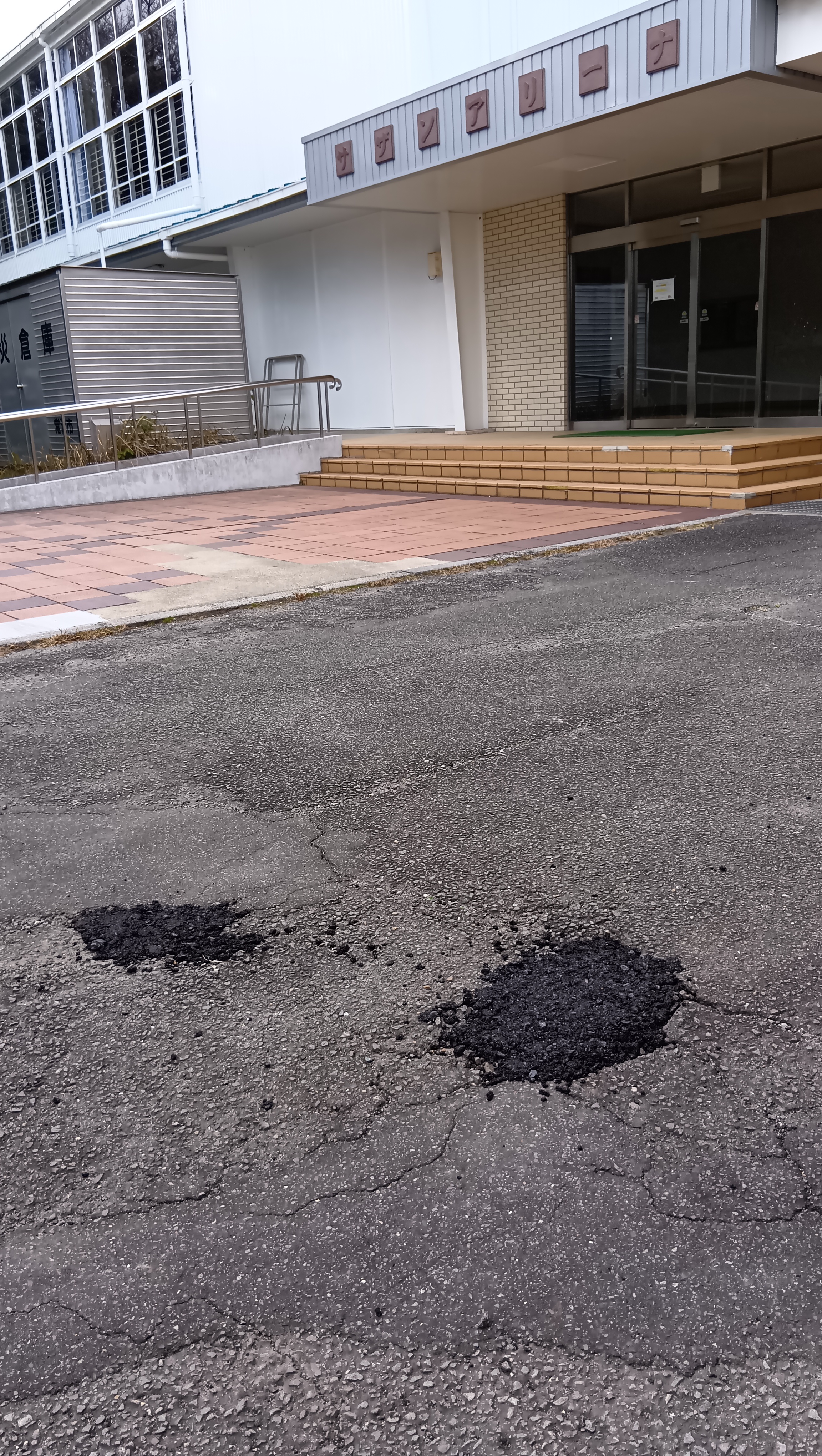 会館前の駐車場や、アリーナと会館の間の通路など、アスファルトがはがれて、少しへこんでいる箇所がありました。本日、大きな破損部分については補修していただきました。少しでも利用しやすい公民館にしていきたいと思いますので、今後ともよろしくお願いいたします。