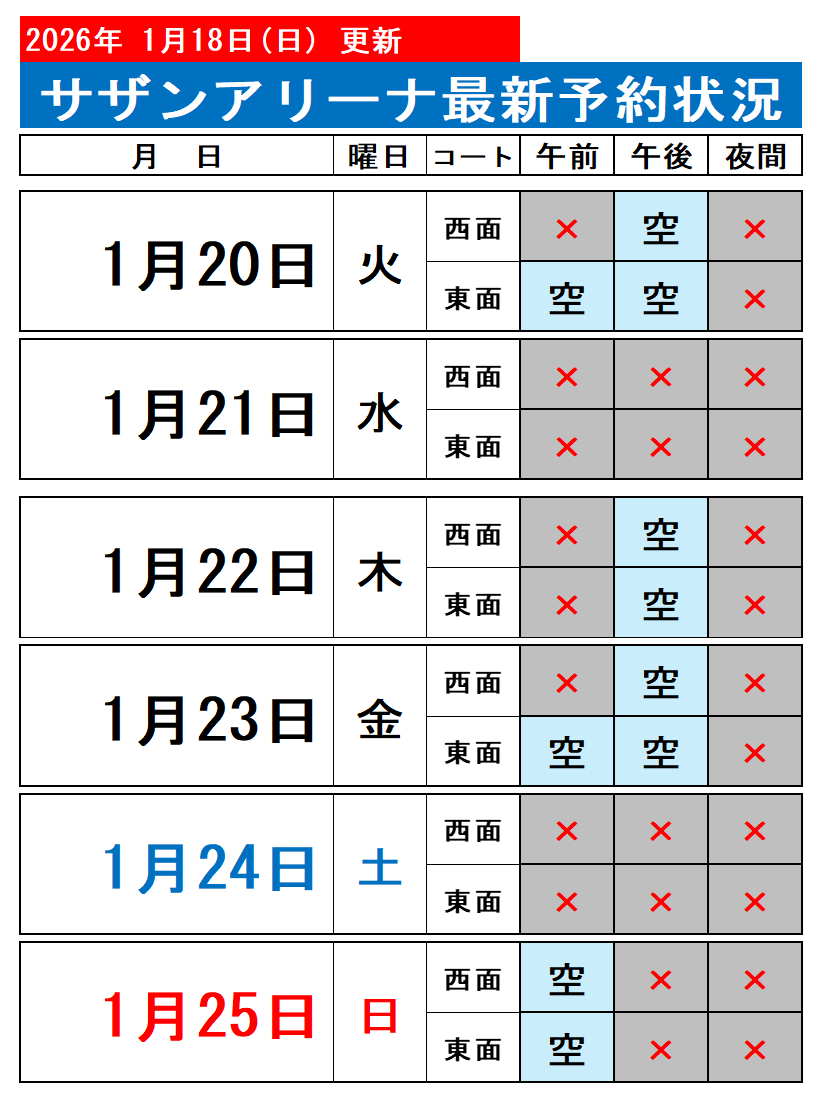 ◎本日より5日先まで、ネットでの空き状況はご確認いただけませんので下記の日程表をご覧ください。 尚、キャンセルまたは前日までのお支払い等で、変更になる場合がございます。 当日利用をご希望の方は、当日にお電話か窓口にてお問い合わせください。 占有はできませんので、皆さんでシェアをお願い致します。