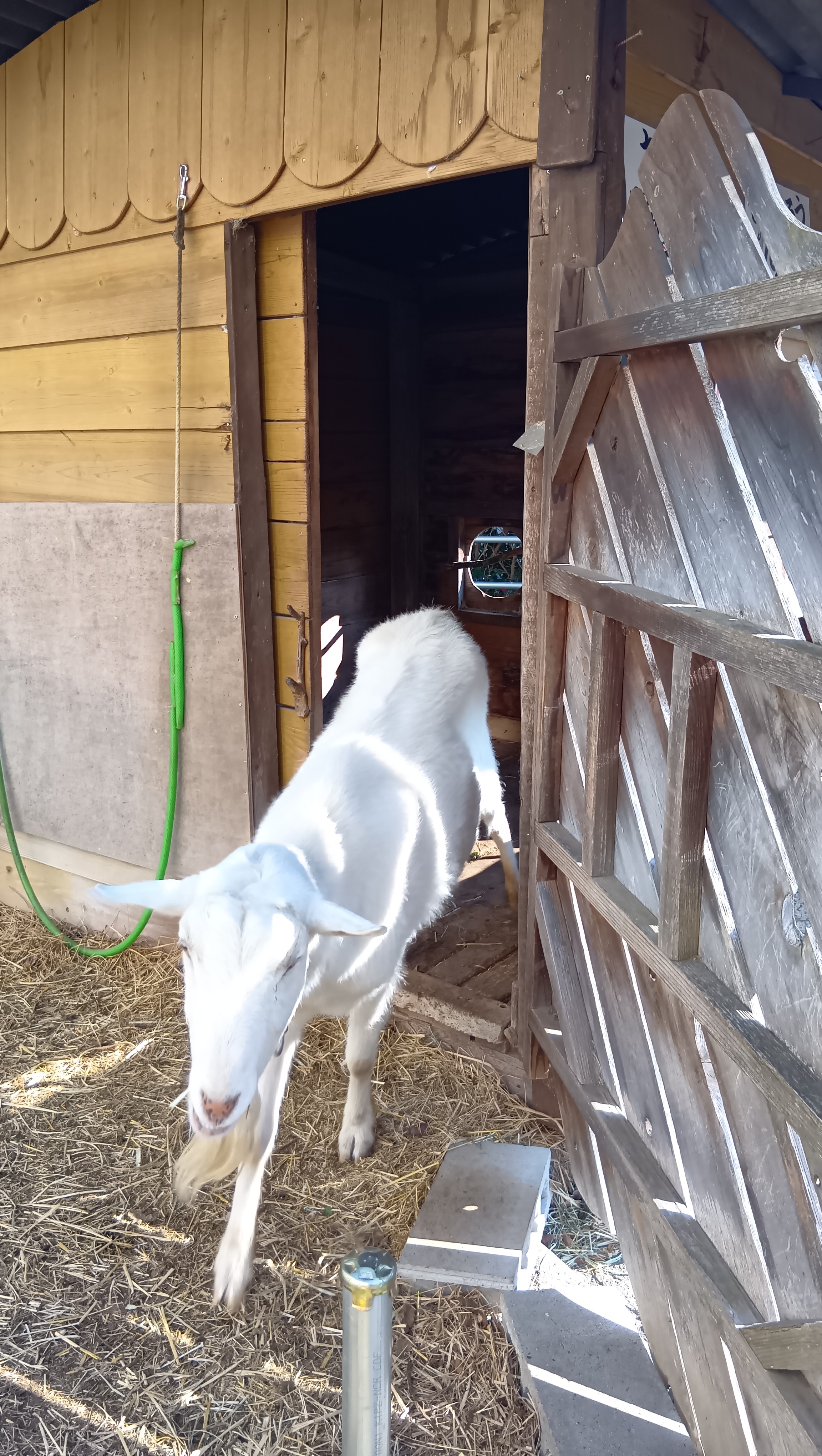 以前から自分で小屋の引き戸をあけて外へでてくることがありましたが、最近では、引き戸の落とし棒でロックがしてあっても、ドアを持ち上げて開けてしまうようになりました。時には、開けたドアを自分で閉める、ということもやってのけるようになってきました。しろたろうの進化に驚かされるばかりです。