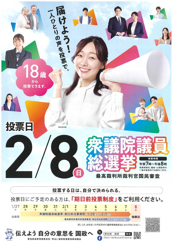 ご存じかとは思いますが、2月8日(日)衆議院議員総選挙と最高裁判所裁判官国民審査の投票日になっています。投票日は予定のある方用に「期日前投票制度」もあります。場所は常滑市役所(8:30~20:00)で投票ができます。ただ、それぞれ期日前投票期間が違うのでご注意ください。