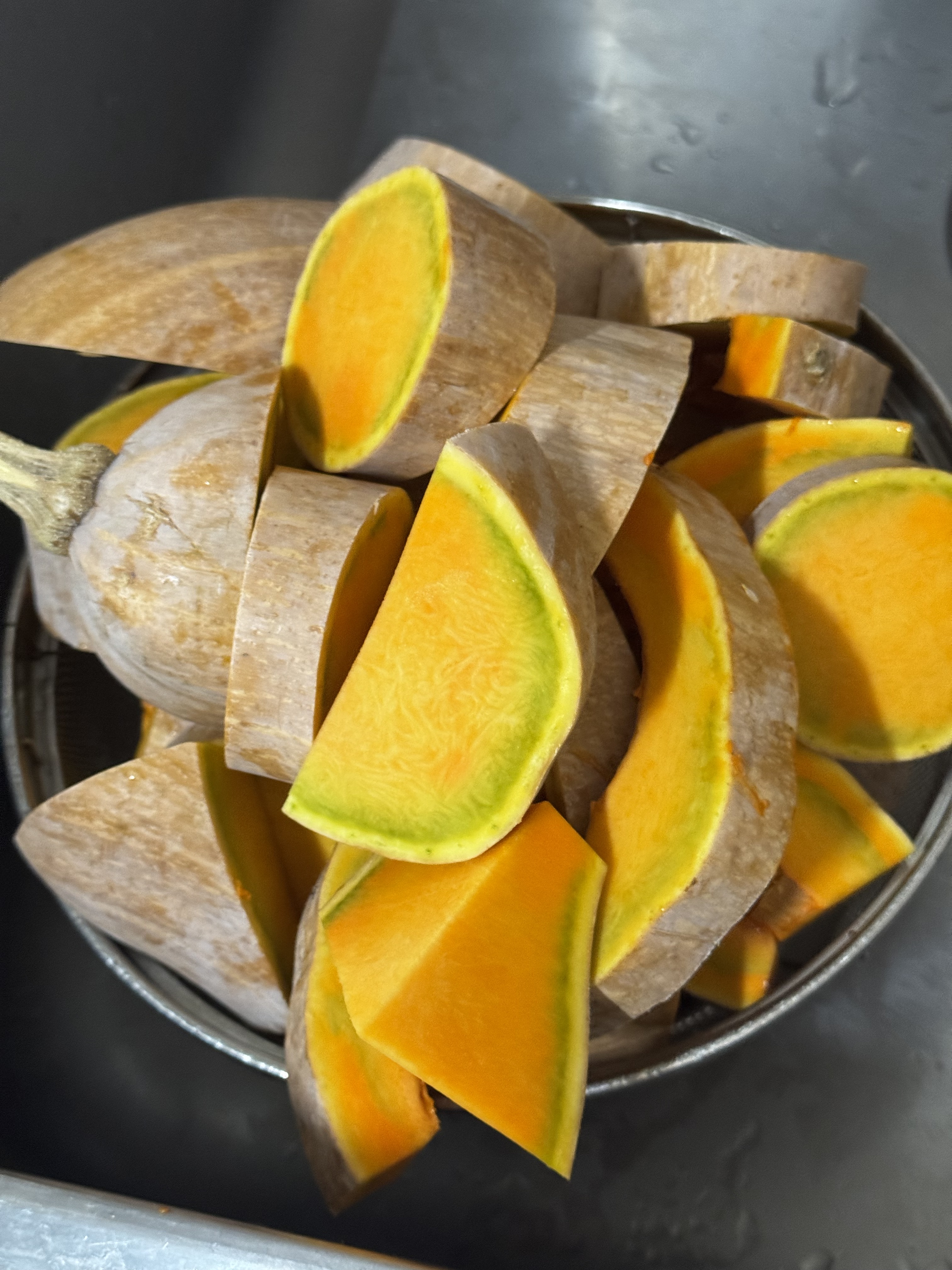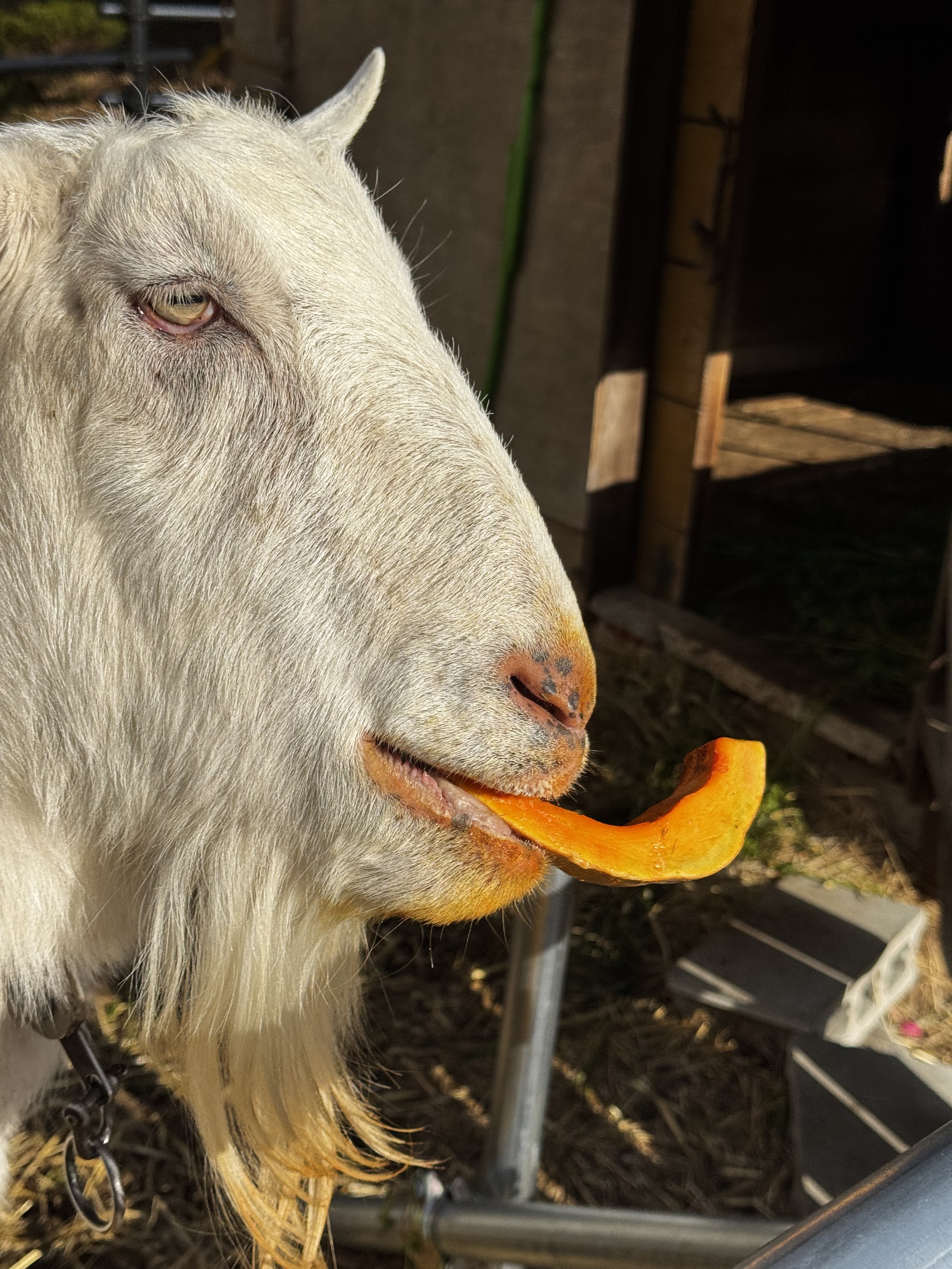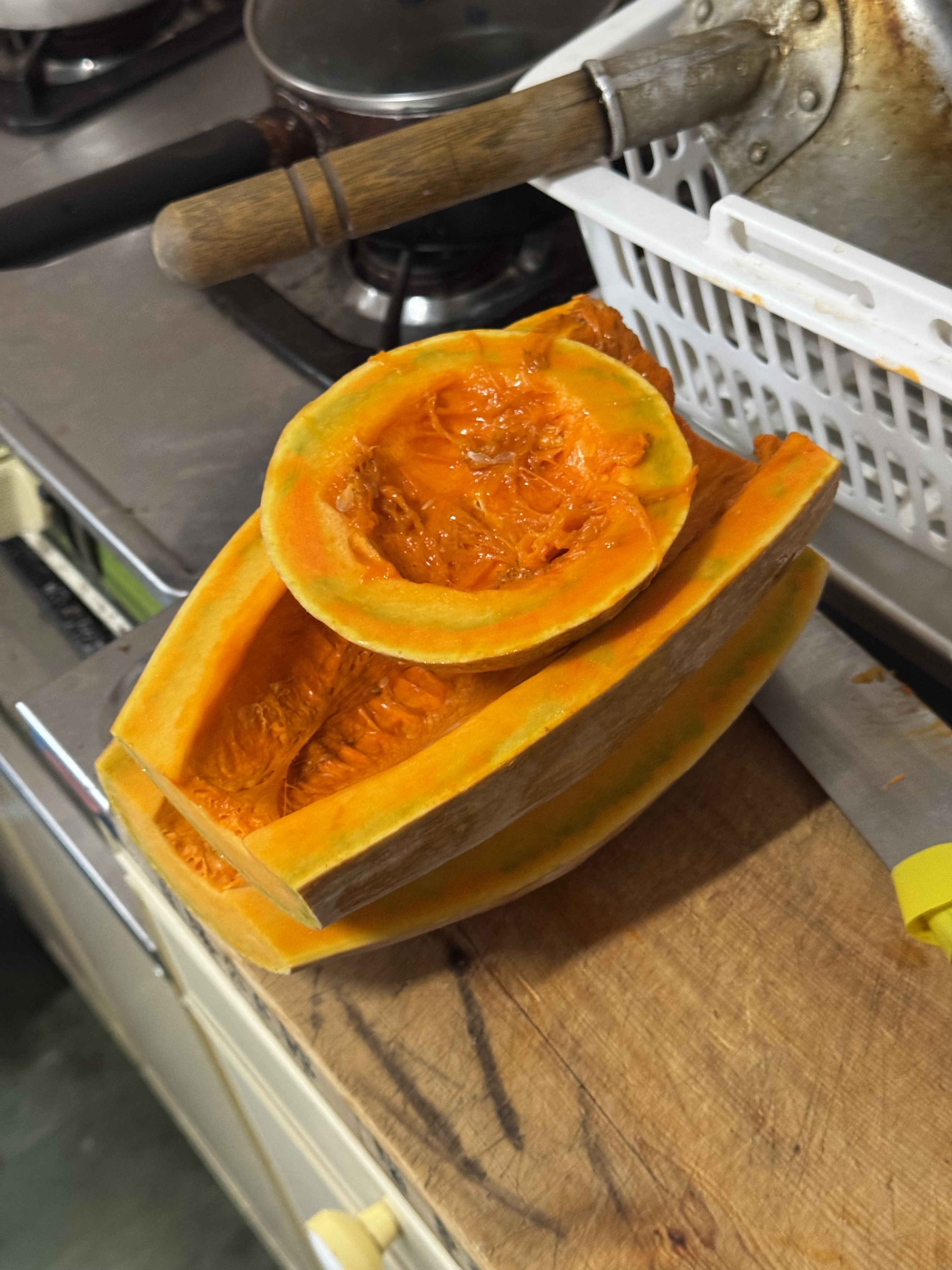 種を出したカボチャはブツ切りにしてしろたろうにあげます。口の周りがオレンジ色になってます