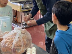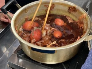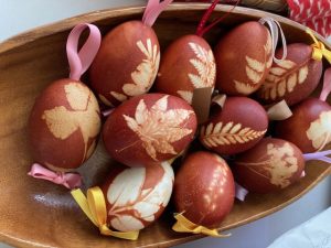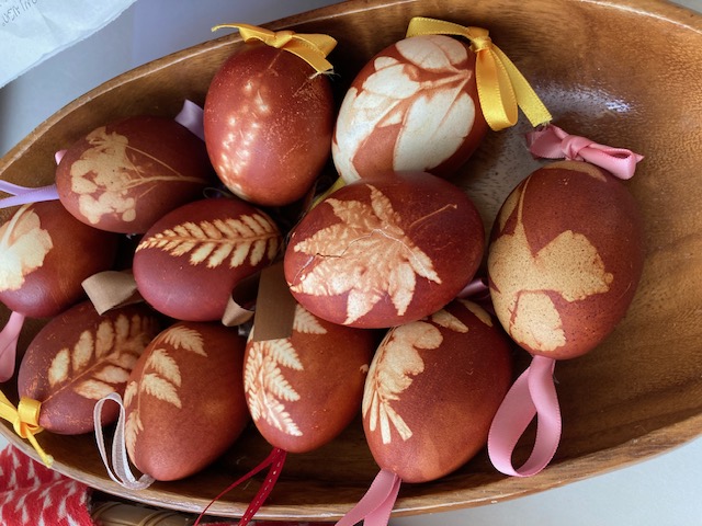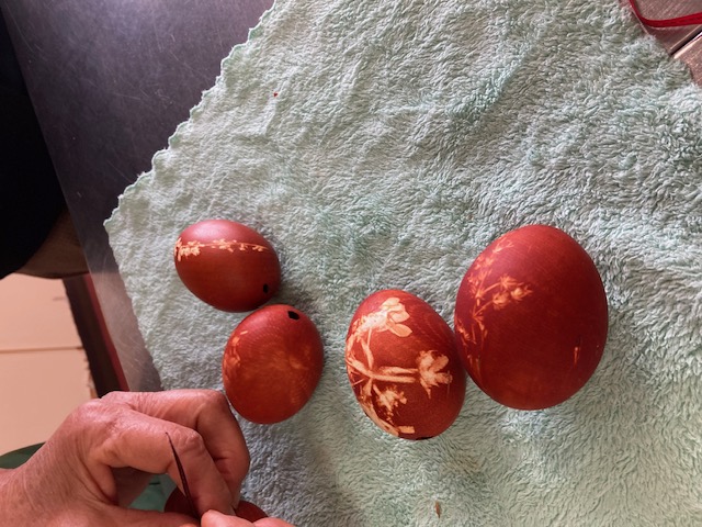卵に押し花を当てて網袋の中へ入れ、たまねぎの皮で染めるよ、30分くらいかなぁ