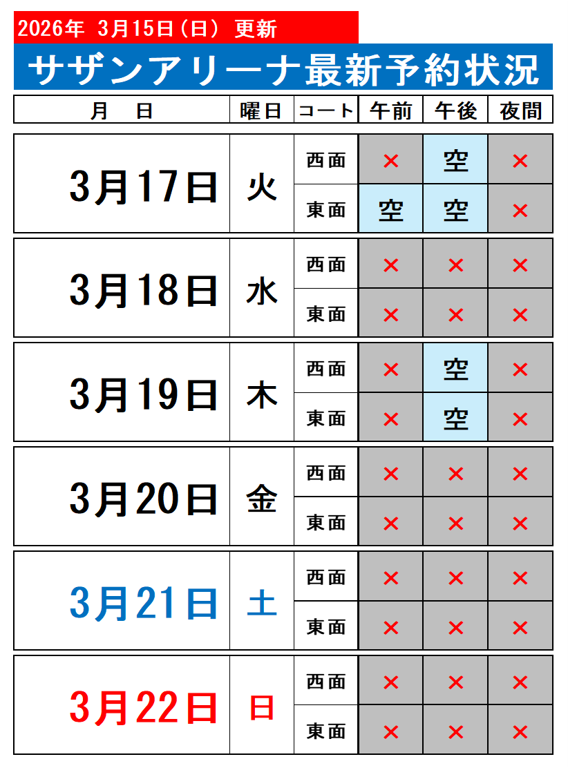 なお、本日より5日先までは、ネットでの空き状況はご確認いただけませんので、下記の日程表をご覧ください。 尚、キャンセルまたは前日までのお支払い等で、変更になる場合がございます。