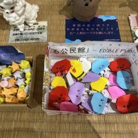 皆さまこんにちわ。 8月の気まぐれクラフトのご紹介です。 今月はジンベエザメとキャンディーを作ってみました。 お一人様お一つずつどうぞ。   [南陵公民館]