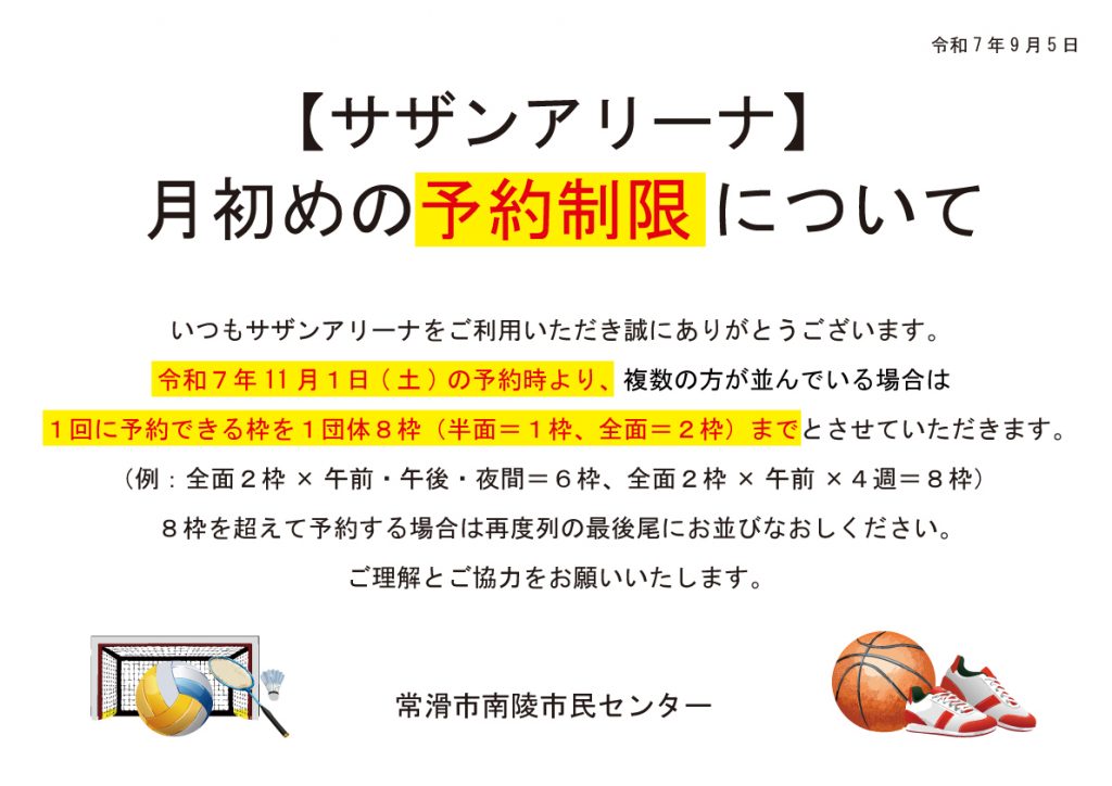 令和7年11月1日(土)の予約時より、複数の方が並んでいる場合は 1回に予約できる枠を1団体8枠(半面=1枠、全面=2枠)までとさせていただきます。 (例:全面2枠×午前・午後・夜間=6枠、全面2枠×午前×4週=8枠)